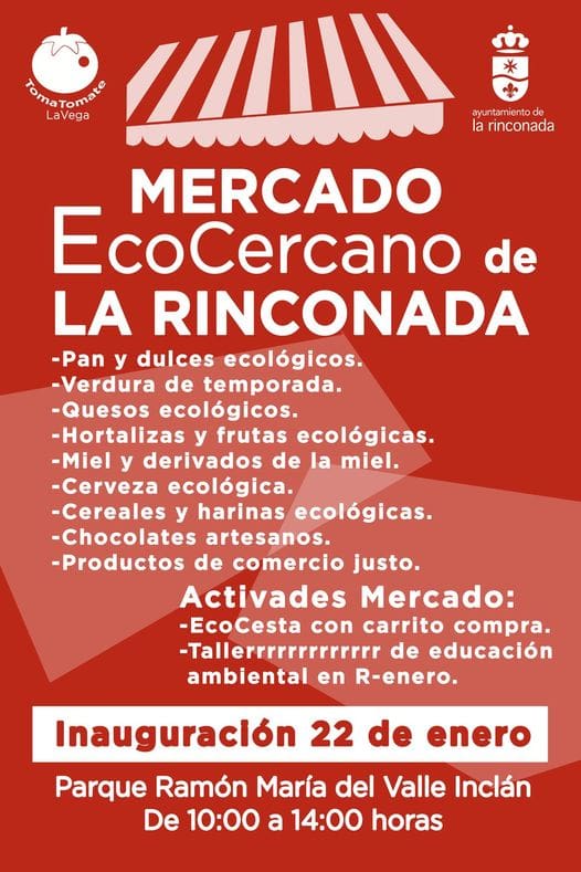 Este nuevo Ecomercado, de la mano organizadora de la Asociación TomaTomate y con el auspicio del Ayuntamiento de La Rinconada, se celebrará de forma mensual cada primer sábado de mes en el Parque Ramón María del valle Inclán, en horario de 10 a 14 horas.